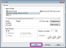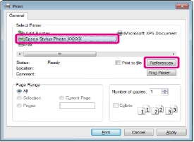 Убедитесь, что выбран нужный принтер и затем щелкните Preferences (Настройки) или Properties (Свойства) для отображения окна настроек.