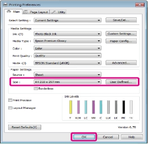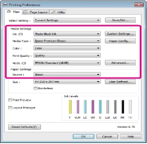 Укажите значения для параметров Media Туре (Тип носителей), Color (Цвет), Print Quality (Качество печати), Mode (Режим) и Source (Источник) в соответствии с бумагой, загруженной в принтер.