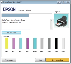 После начала печати появится окно с индикатором хода выполнения задания, показанное ниже. В данном окне представлена информация об оставшемся количестве чернил, номера чернил для принтера и т.д.