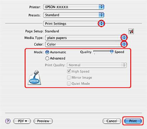 Выберите значения параметров Media Type (Тип носителя), Color и Mode (Режим).