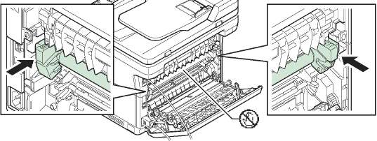 Откройте заднюю крышку и нажмите в местах, показанных на рисунке. Если проблема не решается даже после печати нескольких страниц, обратитесь в сервисную службу.