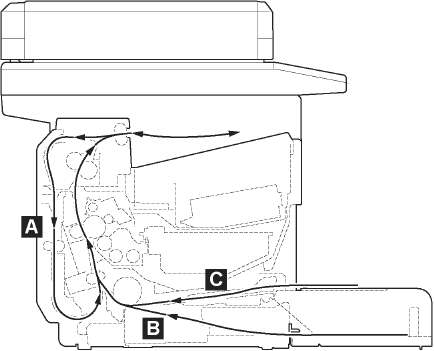 Если бумага застряла в системе транспортирования бумаги или листы бумаги не подаются вообще, аппарат автоматически переходит в автономный режим, и начинает мигать индикатор Внимание. KYOCERA Client Tool может показать место застревания бумаги (узел, в котором произошло застревание бумаги). Удалите застрявшую бумагу. После удаления застрявшей бумаги аппарат возобновит печать.