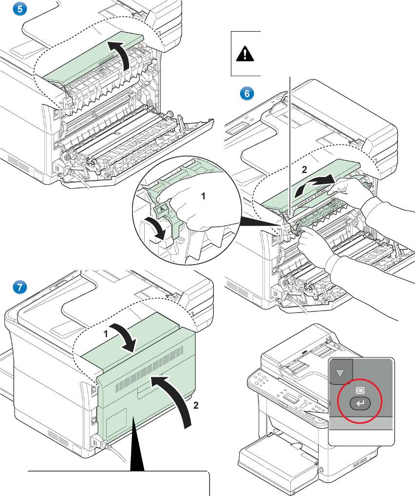 Закройте заднюю крышку для устранения ошибки. Аппарат прогреется и возобновит печать.