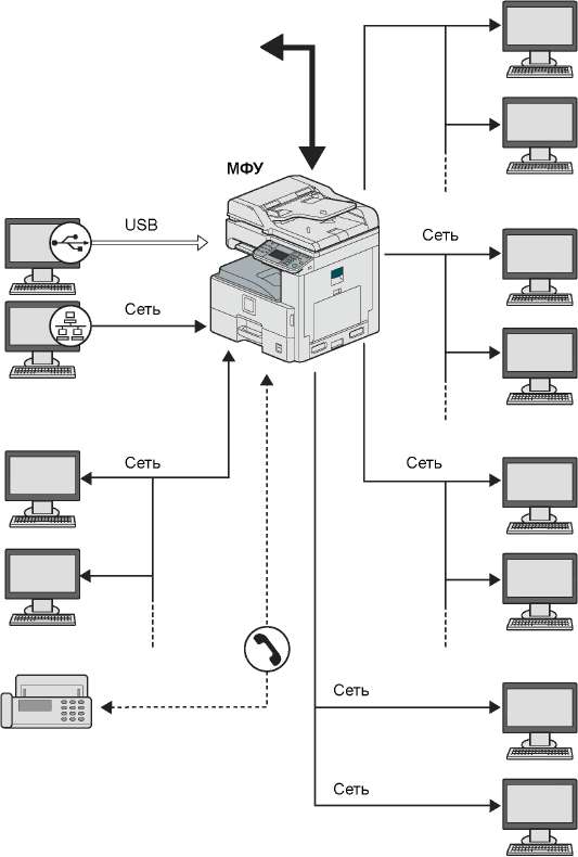 Определите метод подключения аппарата к компьютеру или сети, для справки см. рисунок ниже.