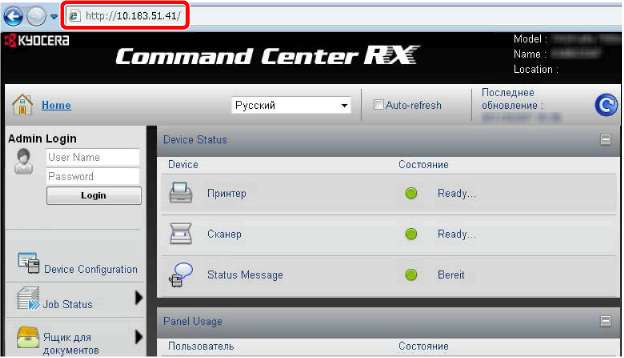 На веб-странице отображается основная информация об аппарате и Command Center RX, а также их текущее состояние.