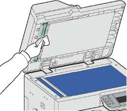 В случае появления черных полос или загрязнений на копиях при использовании податчика документов, протрите поверхность щелевого стекла мягкой тканью, входящей в комплект поставки.