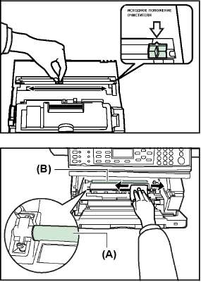 Используйте прилагаемую чистящую тряпку для стирания пыли от бумаги и грязи, накапливающихся на металлическом регистрационном ролике (A) внутри аппарата.