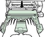 Совместите ручку с левой стороны с пазом на узле обработки и вставьте картридж в узел обработки. Нажмите на область, имеющую маркировку PUSH HERE (НАЖМИТЕ ЗДЕСЬ), до щелчка.