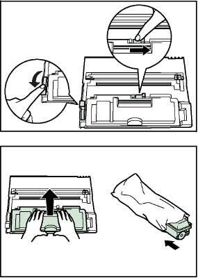 Переведите фиксирующий рычаг в положение UNLOCK (РАЗБЛОКИРОВАН), а затем поверните освобождающий рычаг контейнера с тонером вправо.