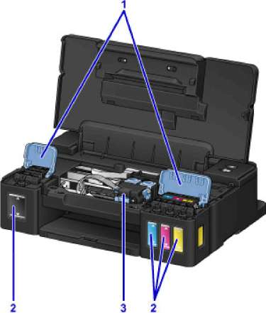 Откройте для повторной заправки чернильных контейнеров или извлечения замятой внутри принтера бумаги.
