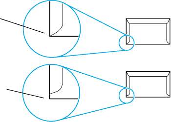 Конверты с линиями склейки на обеих сторонах обычно имеют вертикальные, а не диагональные швы. Конверты такой конструкции более подвержены скручиванию. Убедитесь в том, что линия склейки доходит до самого угла конверта, как показано на рисунке.