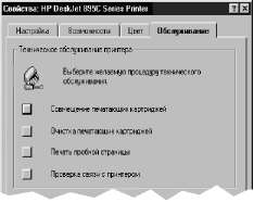 Проведение регулярного технического обслуживания принтера. Выберите эту вкладку для «Совмещения», «Очистки», «Печати пробной страницы» или «Проверки связи с принтером».