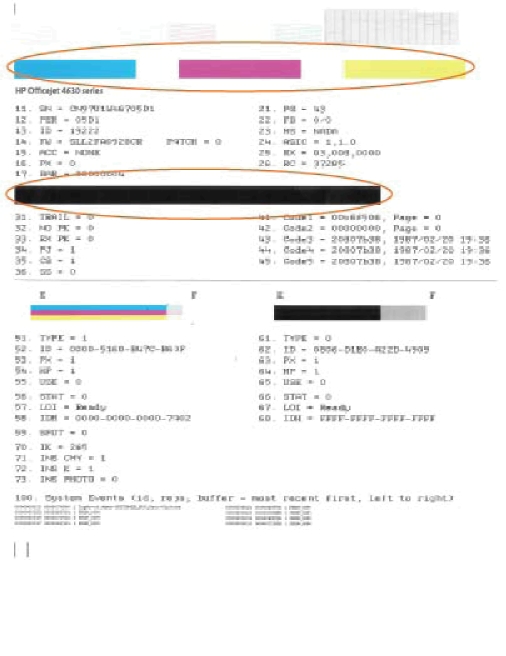г. На вкладке Отчеты устройства щелкните Печать сведений о диагностике, чтобы распечатать страницу диагностики. Оцените качество печати в голубой, пурпурной, желтой и черной области на странице диагностики. Если в черной или цветных областях видны полосы или отсутствуют чернила, выполните автоматическую очистку.