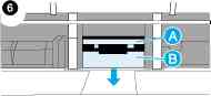 6 Одной рукой установить новую пластину в гнездо для подающей пластины (А). Просунув другую руку через вырез для подающего лотка, отвести подпружиненный держатель вниз (Б).