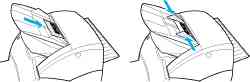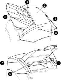 Подающий лоток (1) расположен в верхней части передней панели сканера. Установленные в подающем лотке направляющие (2) обеспечивают подачу бумаги в сканер без перекосов. Приемный лоток (3) расположен под подающим лотком.