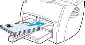 В лоток первоочередной подачи можно загружать до 10 листов бумаги плотностью 20 фунтов, а также одиночные конверты, листы диапозитивной пленки или открытки. Листы и конверты следует укладывать верхним краем вперед и лицевой стороной для печати вверх. Во избежание заторов и перекосов бумаги необходимо правильно отрегулировать положение боковых направляющих.