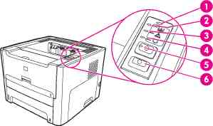 5 Клавиша и индикатор пуска. Чтобы распечатать демонстрационную страницу или продолжить печать в режиме подачи вручную, нажмите и отпустите клавишу пуска. Чтобы распечатать страницу конфигурации нажмите клавишу пуска и удерживайте ее нажатой в течение 5 секунд.