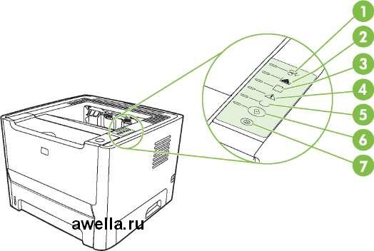 На панели управления принтера расположены шесть световых индикаторов и две клавиши. С помощью индикаторов можно определить состояние принтера.