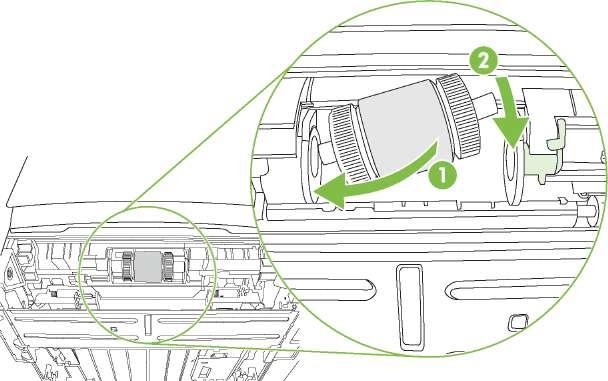 12. Установите подающий ролик левой стороной в левый разъем (1), а правой стороной (с насечками на валике) - в правый разъем (2).