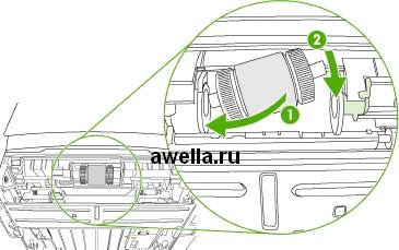 Установите подающий ролик левой стороной в левый разъем (1), а правой стороной (с насечками на валике) - в правый разъем (2).