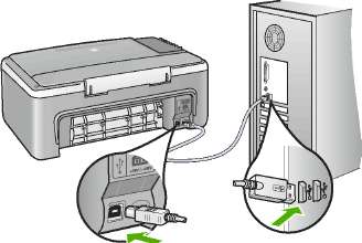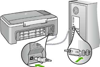 После установки программного обеспечения процедура подсоединения компьютера к аппарату с помощью кабеля USB очень проста. Подключите один конец кабеля USB к разъему на задней панели компьютера, а другой - к разъему на задней панели устройства. Подсоединять кабель можно к любому порту USB на задней панели компьютера.