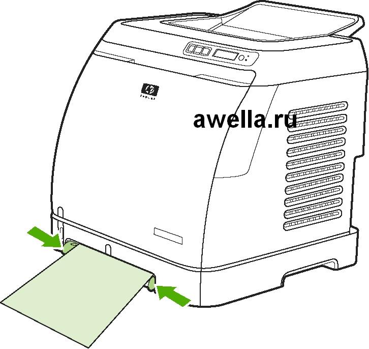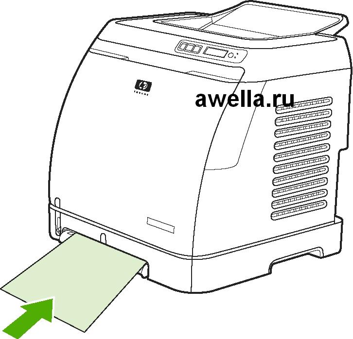 Если это специальная бумага, например, этикетки, прозрачные пленки, глянцевая бумага HP LaserJet, фотобумага HP LaserJet, фирменные или печатные бланки, загрузите ее для печати лицевой стороной вверх и верхним краем в направлении передней части лотка. Лучшее качество печати обеспечите новым оригинальным картриджем.