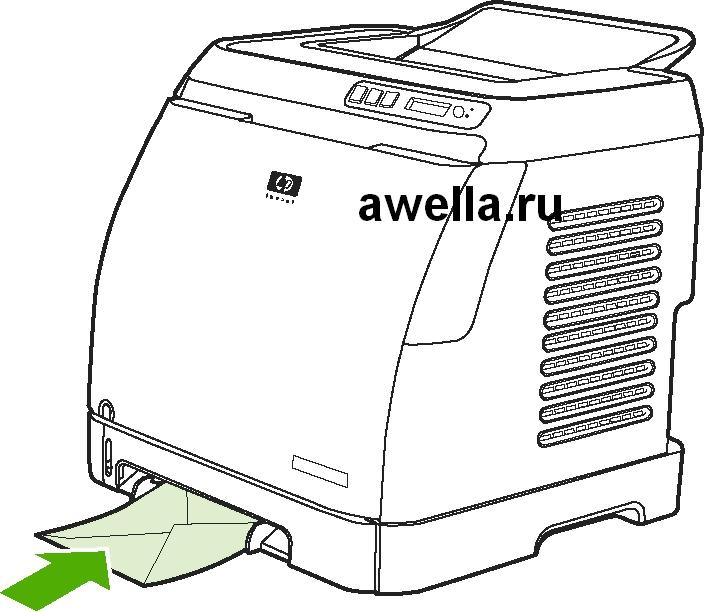 Поместите 10 или менее конвертов в лоток клапанами вправо, стороной для печати вверх и коротким краем к принтеру. Если конверт имеется клапан по короткому краю, этим краем он должен быть обращен к принтеру.