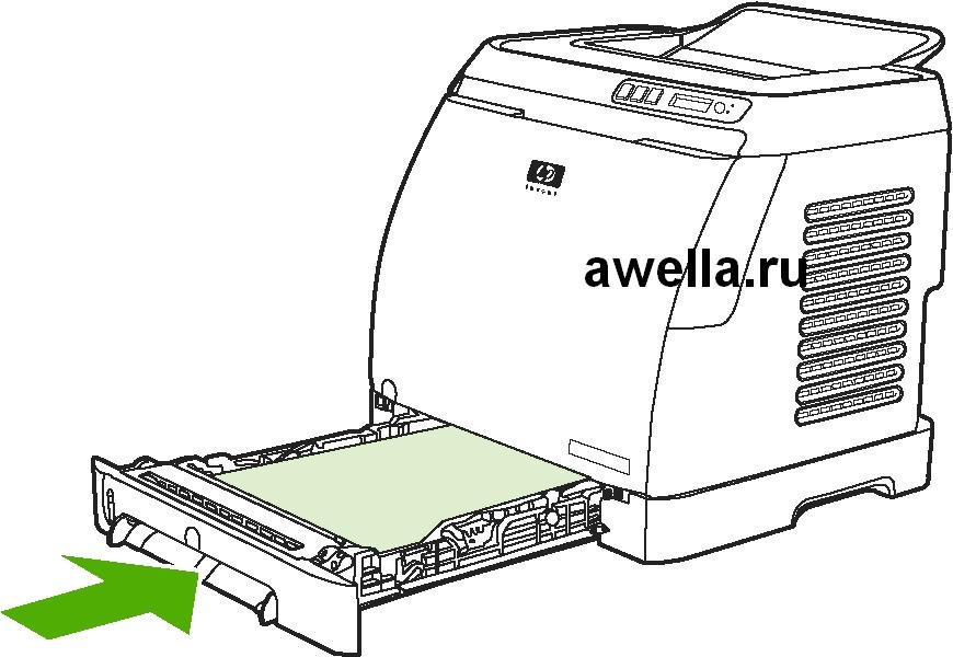 7. Задвиньте лоток в принтер. Задняя часть лотка будет выступать с обратной стороны принтера.
