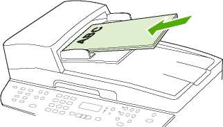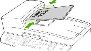 1. Загрузите документы, которые необходимо скопировать, во входной лоток устройства автоматической подачи документов (АПД), положив первую страницу лицевой стороной вверх; при этом верхняя часть страницы направлена к устройству АПД.