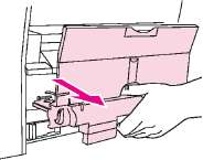 2. Извлеките элемент устранения замятия. Отсоедините его, потянув вверх обеими руками за две ручки. Поверните и поднимите элемент устранения замятия и отложите его в сторону.