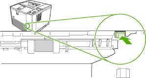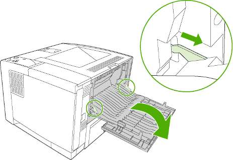 Откройте четыре защелки в центре черной направляющей для бумаги за нижней задней дверцей.