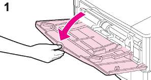 1 Откройте лоток 1, но не выдвигайте удлинитель (протяжка конвертов выполняется более надежно без использования удлинителя).