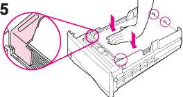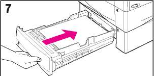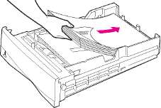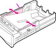 5 Убедитесь в том, что бумага в лотке располагается ровно во всех четырех углах и находится под выступами на ограничителях. Задвиньте лоток обратно в принтер.