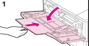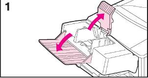 2 Откройте задний приемник и выдвиньте удлинитель лотка. (Это уменьшает вероятность изгибания конвертов и появления складок.)