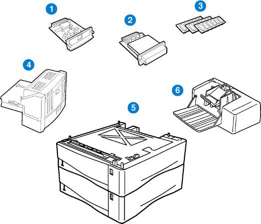 Возможности принтера могут быть расширены с помощью дополнительных принадлежностей, как показано ниже.