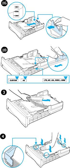 2 Если лоток еще не отрегулирован для нужного размера бумаги, Вам понадобится выполнить максимум три настройки: