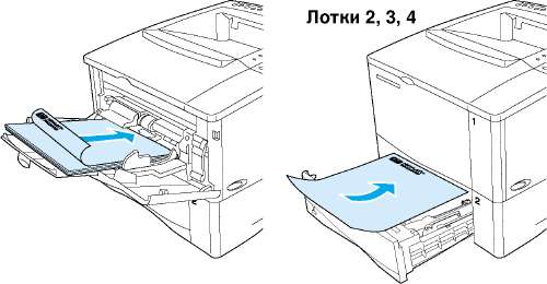 При работе с лотком 1 загружайте листы лицевой стороной вниз верхним краем по направлению к себе. При работе с другими лотками загружайте листы лицевой стороной вверх верхним краем по направлению к принтеру.