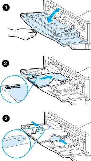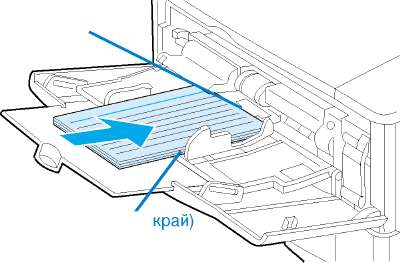 в середину лотка 1 стороной для печати вверх и краем с маркой по направлению к принтеру. Задвиньте конверты в принтер плотно до упора, но без усилия.
