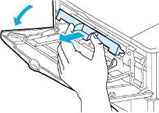 Осторожно вытяните бумагу из принтера. Если часть бумаги была уже затянута в принтер, следуйте процедуре, описанной в разделе "Очистка заторов под верхней крышкой и в участке, где он находится".