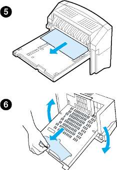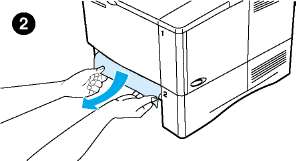 2 Возьмитесь за оба края бумаги и осторожно вытяните ее из принтера. (На бумаге может оставаться порошок тонера. Постарайтесь не высыпать его на себя или в принтер.)