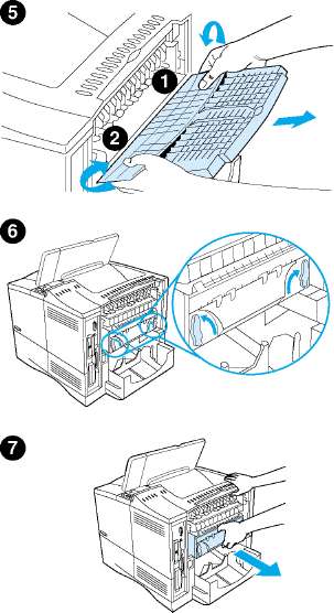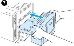 7 Вытащите печку из принтера. Чтобы извлечь печку из принтера, придерживайте принтер за заднюю часть, когда будете вытягивать печку. Не тяните за черную пластмассовую крышечку.