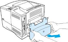 2 Поверните принтер задней частью к себе и удалите пылезащитную крышку или дополнительный модуль двусторонней печати.