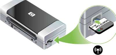 Установите в принтер карту беспроводного доступа HP 802.11 или Bluetooth в слот для карт CompactFlash так, чтобы индикатор смотрел вверх.