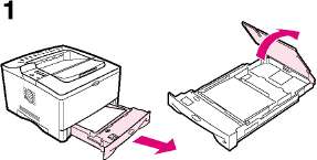 1 Полностью вытащите лоток из принтера. Поднимите крышку лотка.