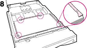 8 Убедитесь, что бумага лежит в лотке ровно, касается опорной поверхности всеми четырьмя углами и попадает под выступы на направляющих.