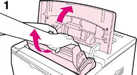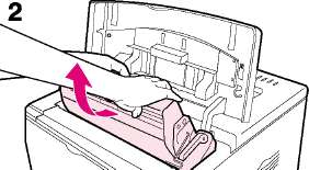 3 Возьмитесь за оба края бумаги и медленно извлеките ее из принтера. (На бумаге может оставаться порошок тонера. Постарайтесь не высыпать его на себя или в принтер.)
