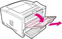 Если затор бумаги произошел в зоне верхнего выходного лотка и большая часть бумаги все еще находится в принтере, то лучше всего извлечь ее с обратной стороны принтера через заднюю дверцу.