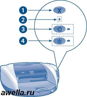 1. Клавиша отмены. 2. Индикатор состояния. 3. Клавиша и индикатор возобновления печати. 4. Клавиша и индикатор питания.