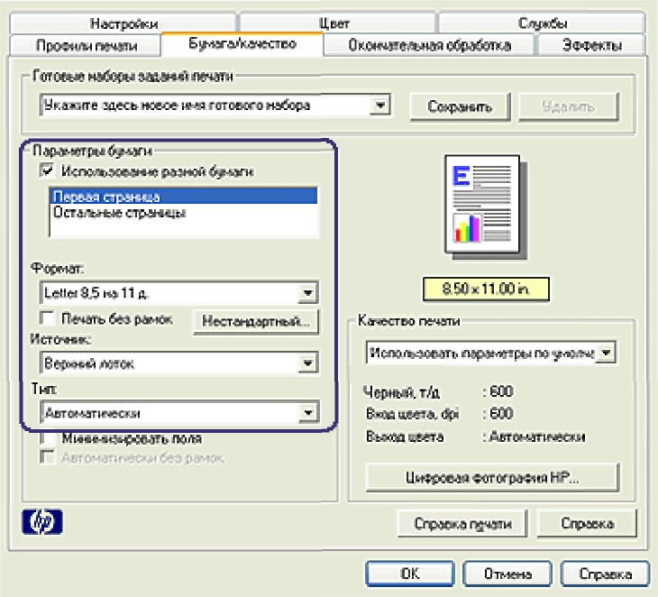 9. В ниспадающем списке Тип выберите тип бумаги для остальных страниц. Не выбирайте вариант Автоматически.