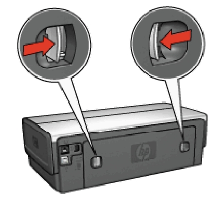 1. Сожмите два фиксаторных рычажка на задней дверце принтера по направлению друг к другу, затем снимите дверцу.